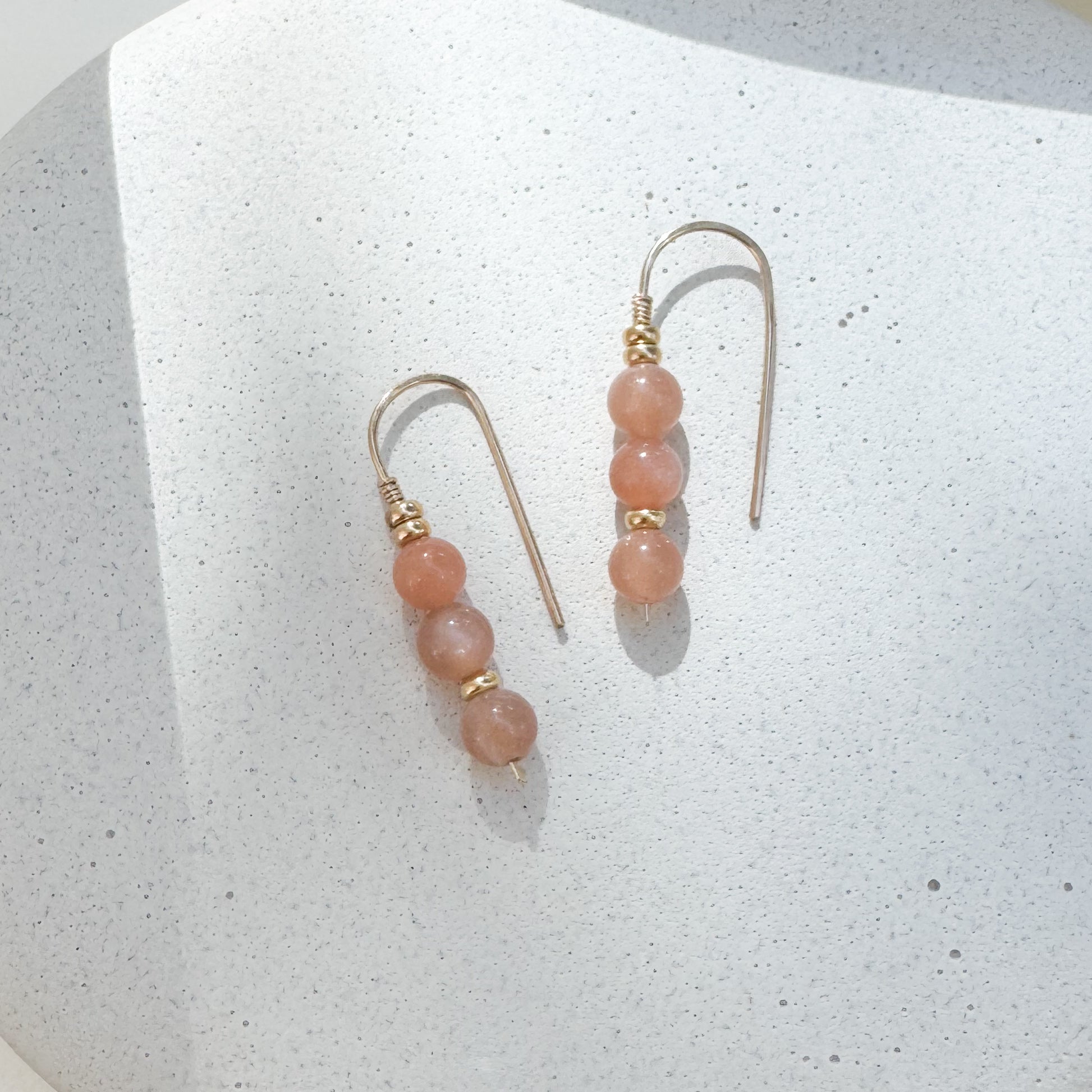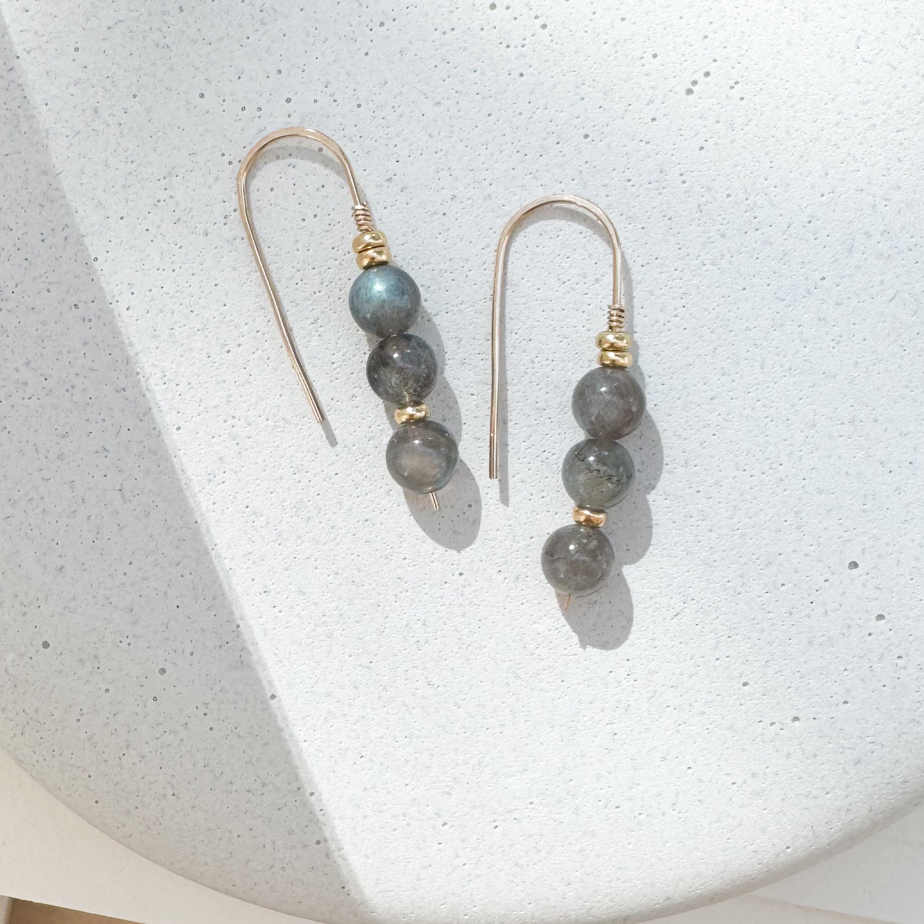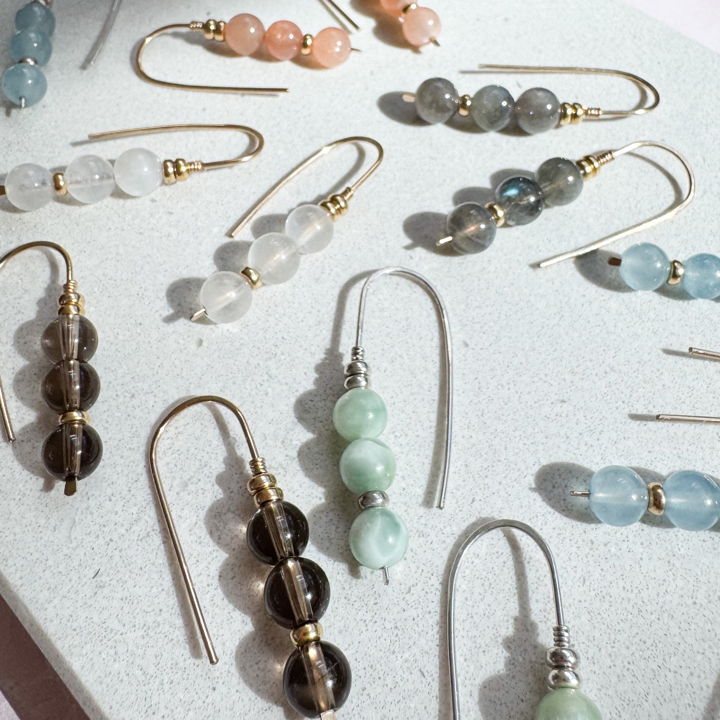 Each Arch Earring features smooth, hand-selected gemstones suspended on a graceful arc of 14k gold fill or sterling silver. They hang approximately 2 inches from the earlobe. Light, modern, and endlessly wearable—the perfect balance of minimal design and natural beauty.