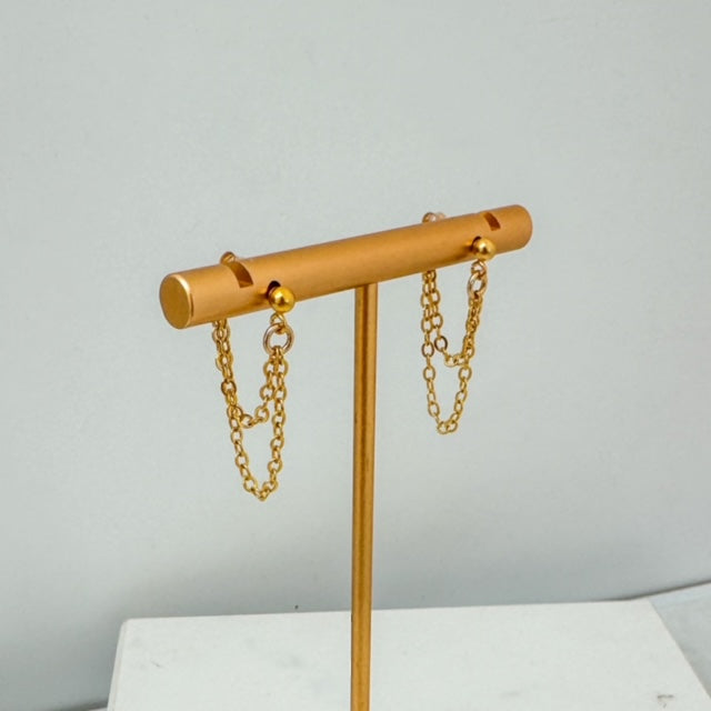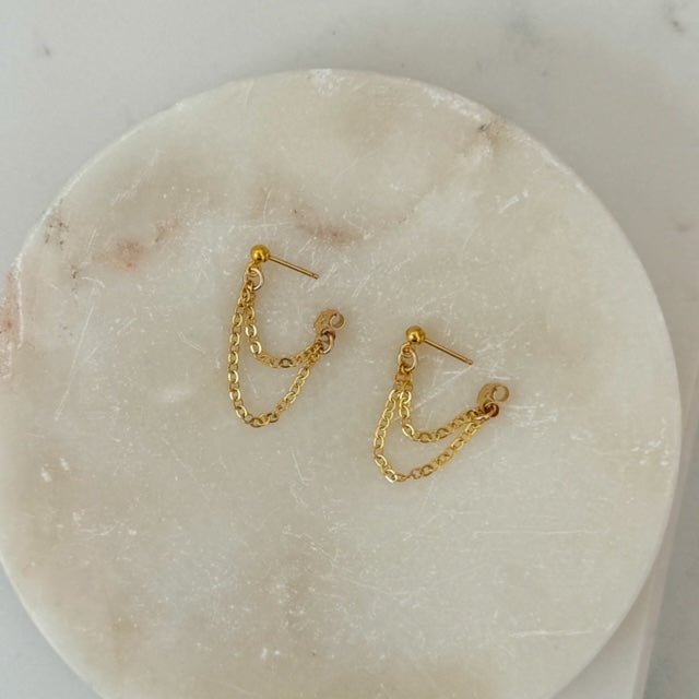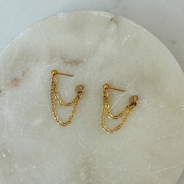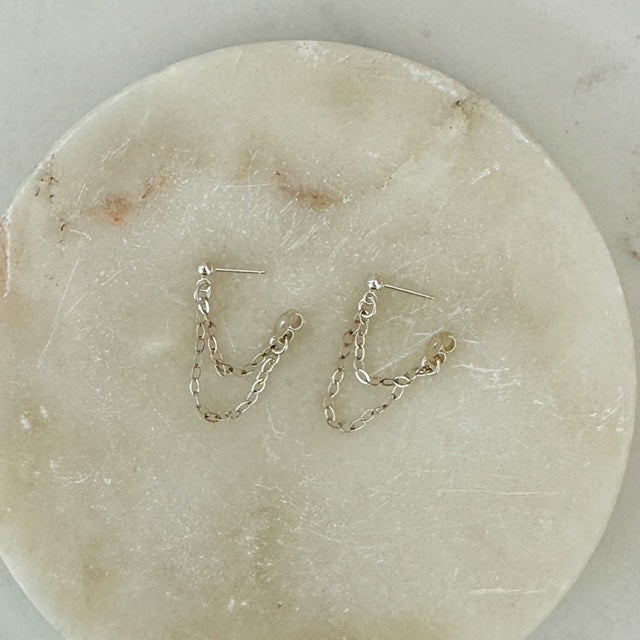 Embrace modern elegance with the Axis Earrings. Crafted in 14k gold fill or sterling silver, each earring features a 3mm ball post stud with delicate cable chains gracefully attached to the ball and earring back. These sleek and stylish earrings are perfect for adding a contemporary touch to any outfit.