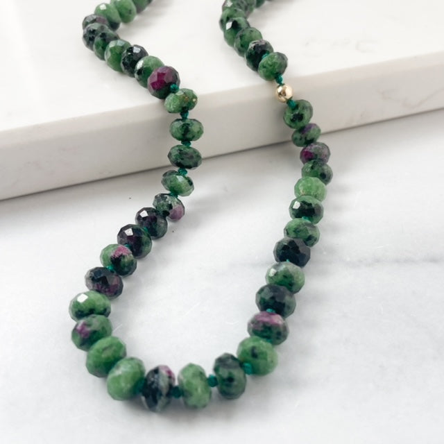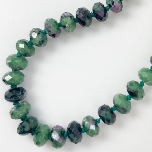 - 10mm faceted ruby zoisite crystal beads hand-knotted on an emerald colored silk cord