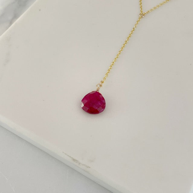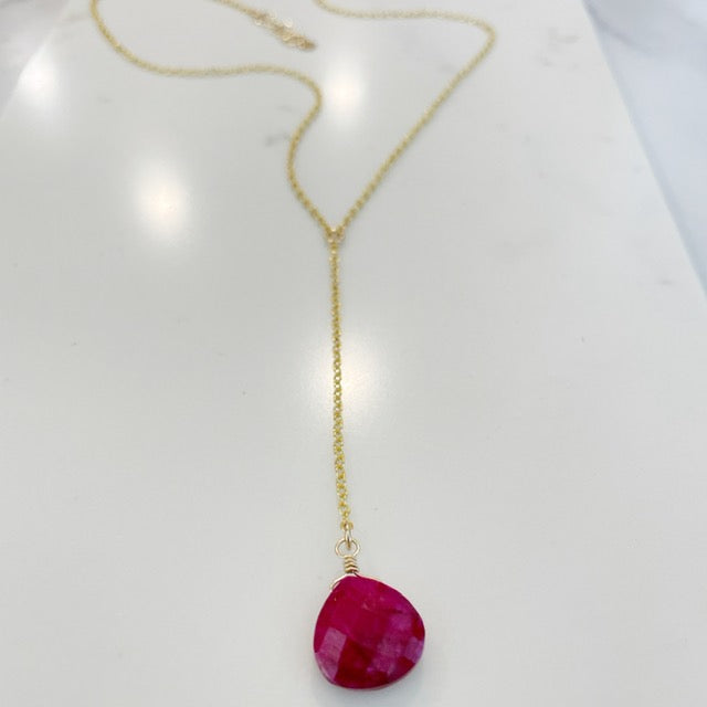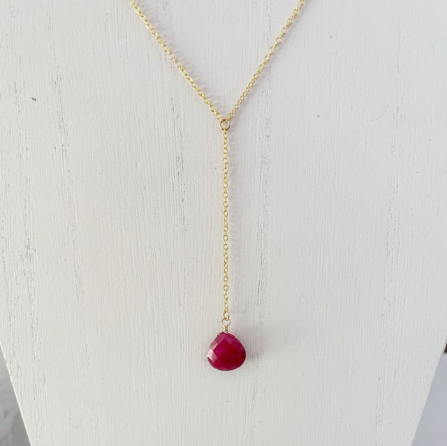 An elegant lariat necklace on a classic 14k gold-fill cable chain featuring an exquisite 14mm ruby briolette. Necklace is 16" with and 1" extender. Drop measures 3" including ruby gemstone.