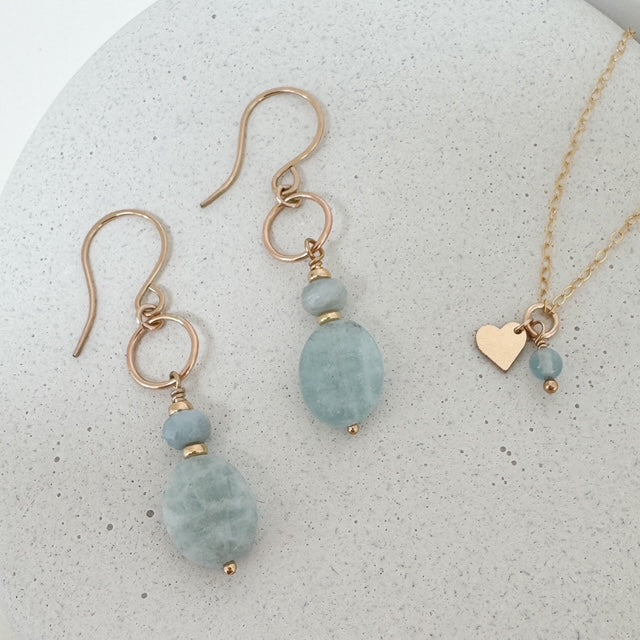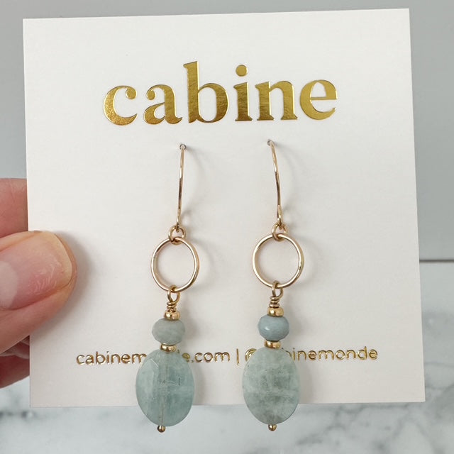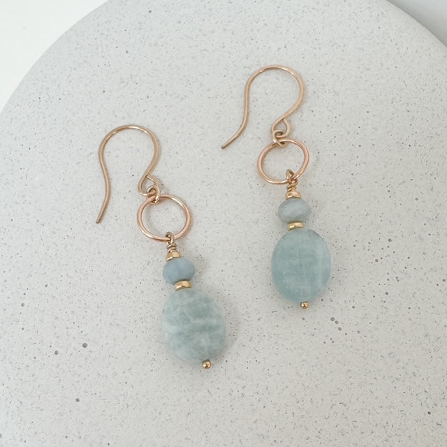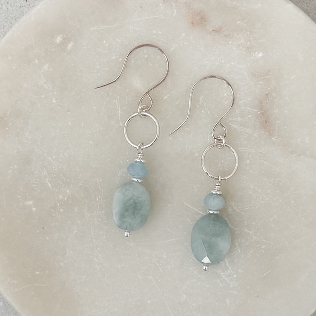 Elegant and serene, the Aquamarine Drop Earrings feature a delicate rondelle and faceted oval-cut aquamarine suspended from a fine 14k gold fill or sterling silver circle. The soothing blue tones of aquamarine bring a sense of calm and effortless sophistication, making these earrings a timeless addition to any jewelry collection.