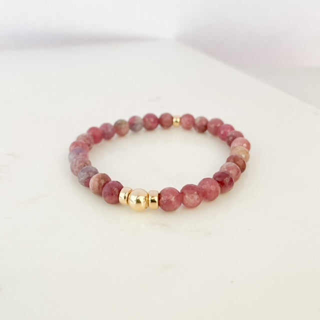 A pink tourmaline stretch bracelet, enhanced with 14k gold fill or sterling silver accents, is a charming and elegant accessory. The delicate pink tourmaline gemstones radiate a soft and romantic allure, while the 14k gold fill or sterling silver accents add a touch of sophistication and refinement.