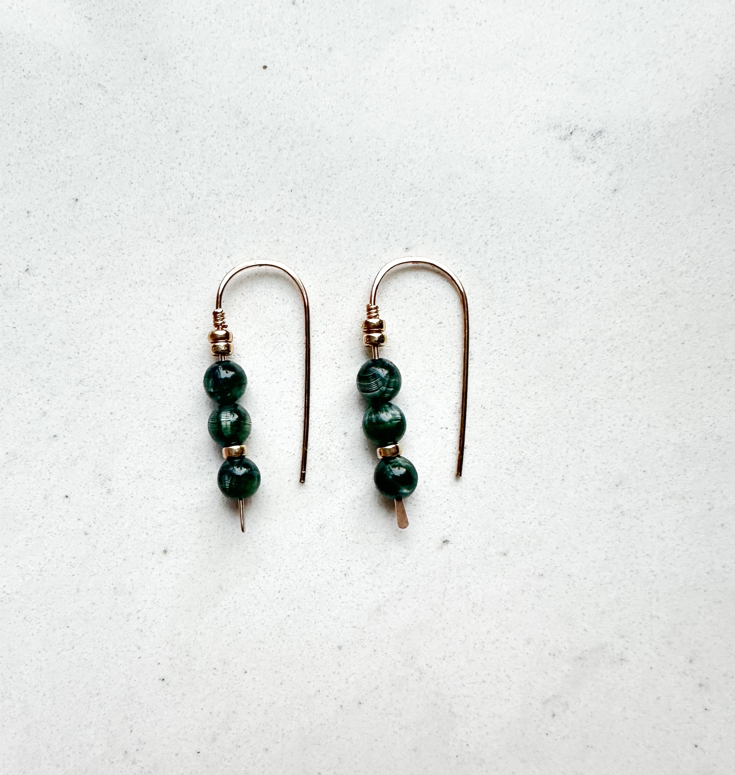Each Arch Earring features smooth, hand-selected gemstones suspended on a graceful arc of 14k gold fill or sterling silver. They hang approximately 2 inches from the earlobe. Light, modern, and endlessly wearable—the perfect balance of minimal design and natural beauty.
